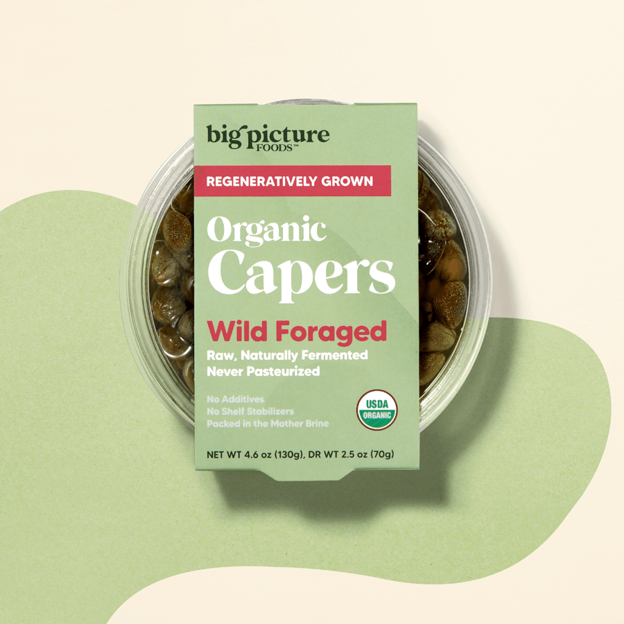 Regeneratively Grown and wild foraged, Big Picture Organic Capers have a fresh taste with nodes of lemon and richer flavor than the grocery shelved capers. With no additives or stabilizers, nourish yourself on the antioxidant, nutrient and probiotic benefits. Try with roasted vegetables, in potato salad, add depth to chicken piccata, or alongside dishes with red peppers and olives.